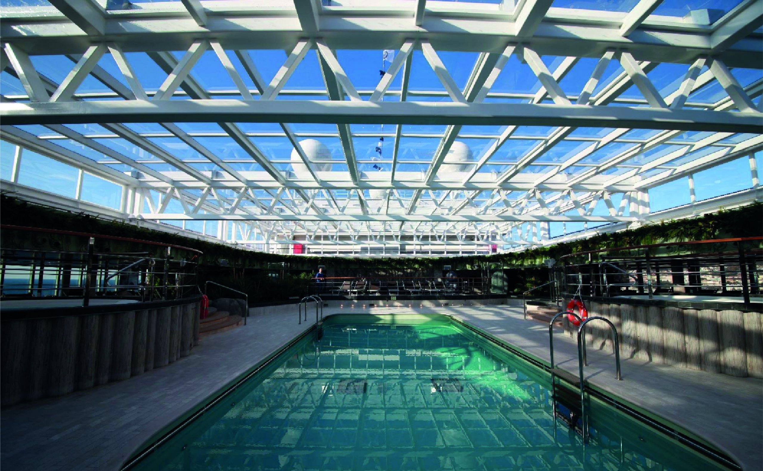 And last but not least branded by Navim Group is also the huge glassy sliding cover, our Skydome shining in all its beauty in the upper deck, above the "Jungle Pool" consenting to all passengers to enjoy it with any weather.