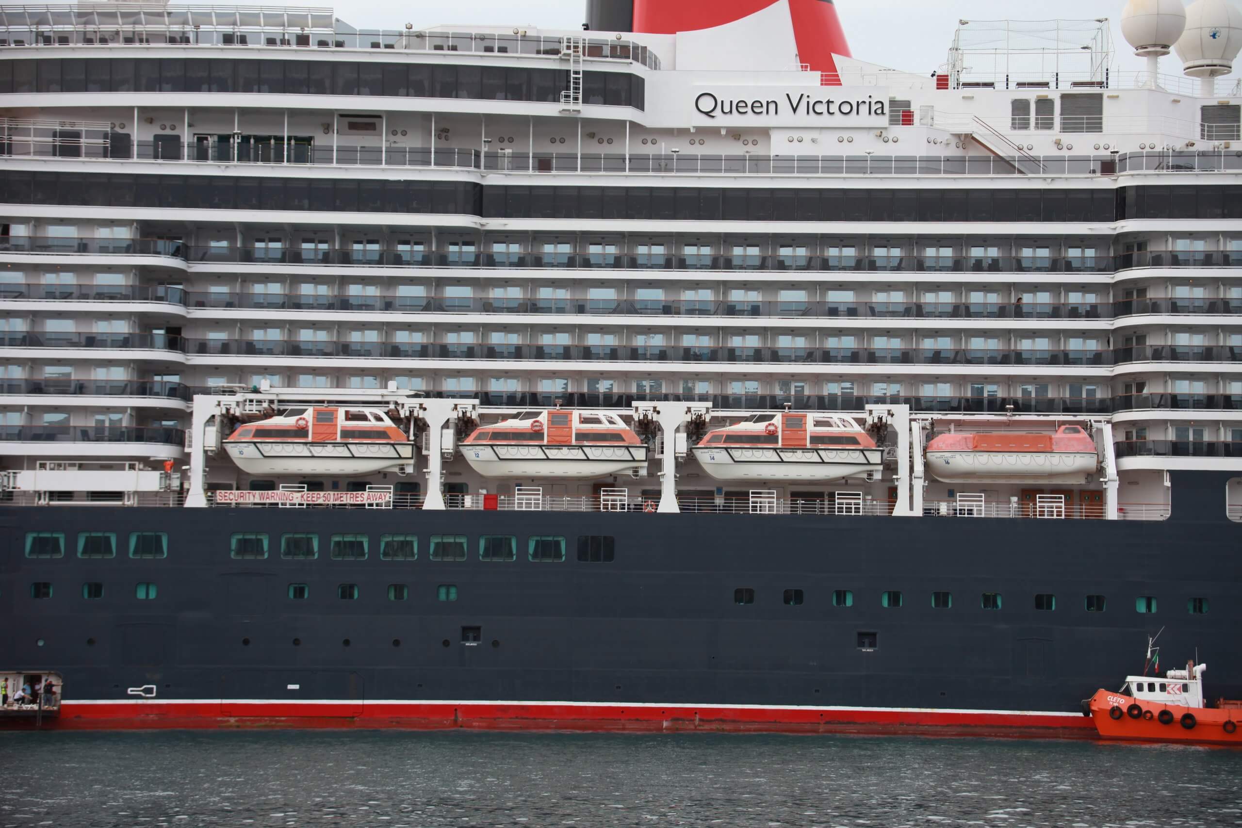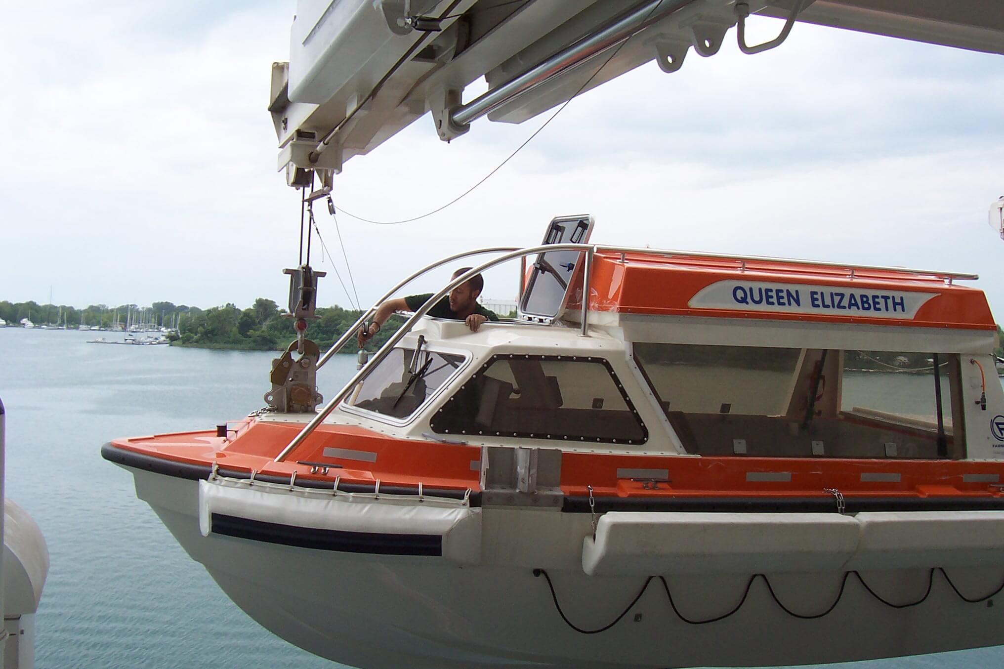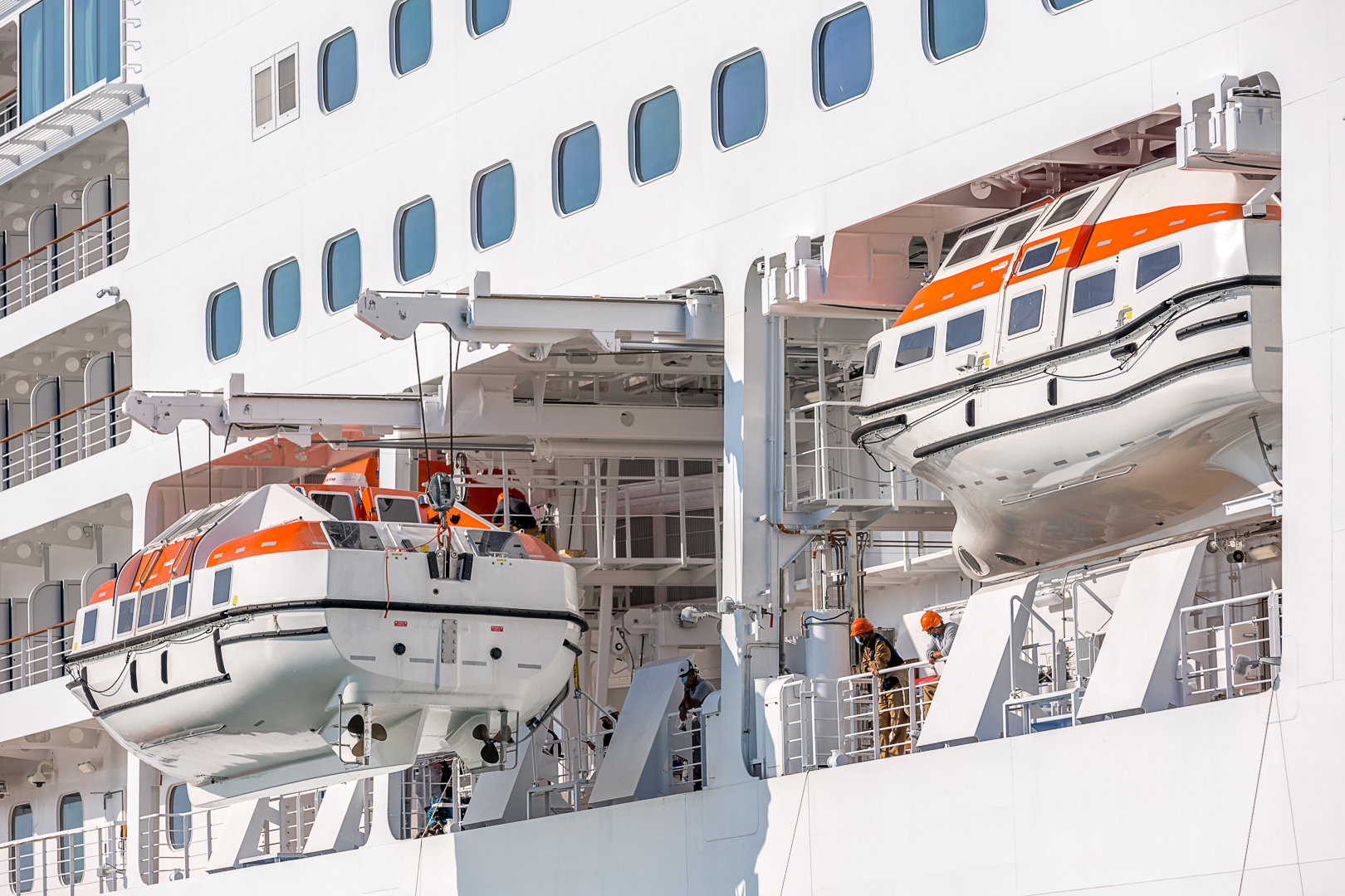 This is in fact a very notable feature of both Queen Victoria’s and Queen Elizabeth lifesaving systems, which primarily comprise 16 enclosed lifeboats and tenders, characterized by two types of davits. These two Queens are the only two ships where such a solution has been chosen, to offer them the best of both alternatives.