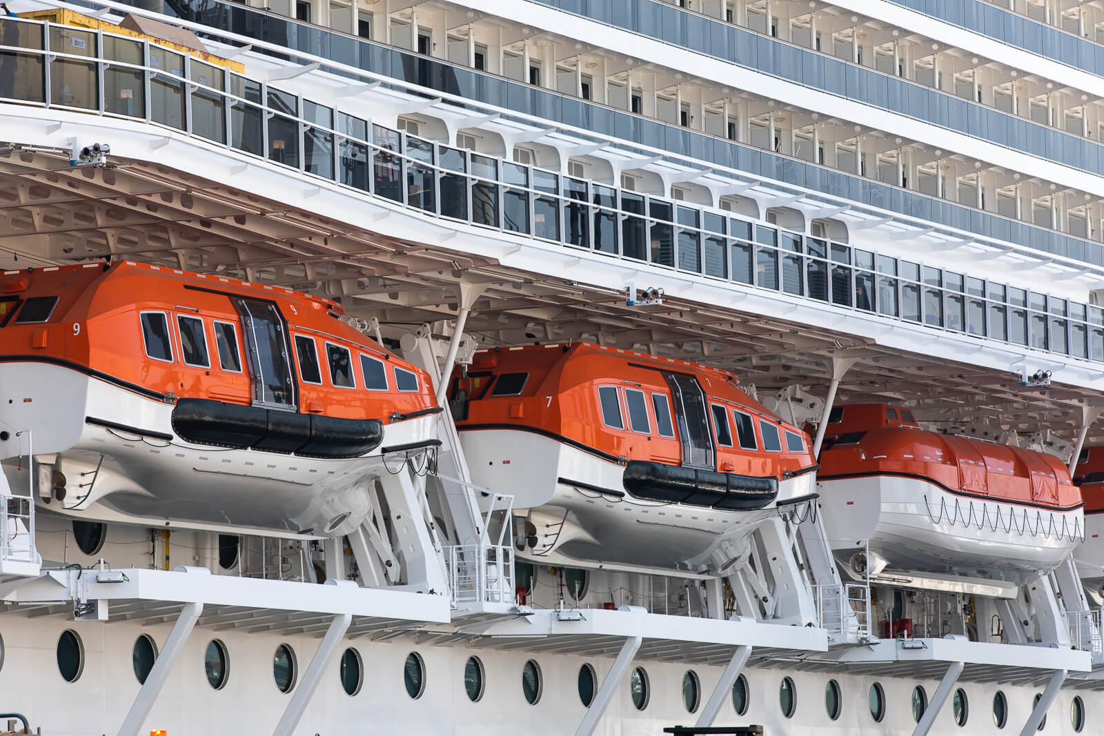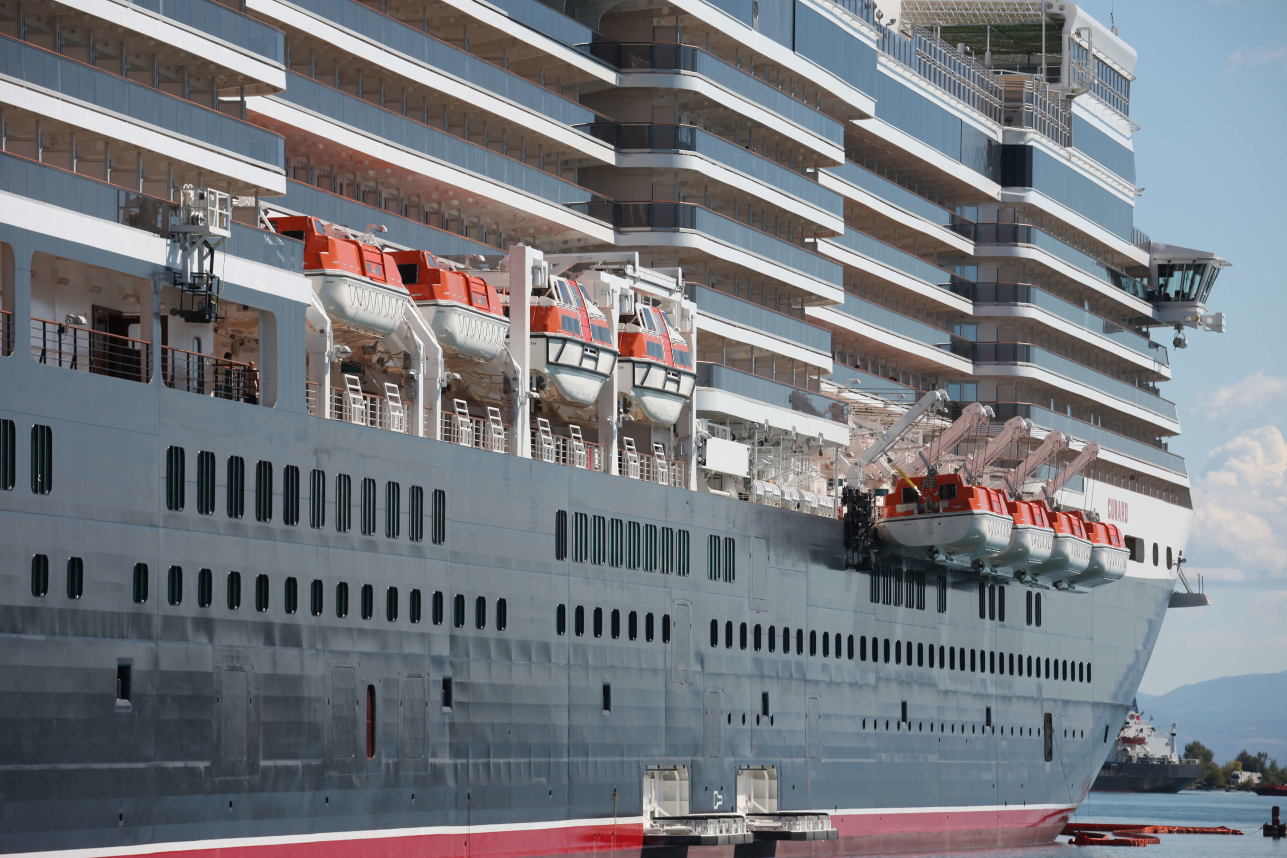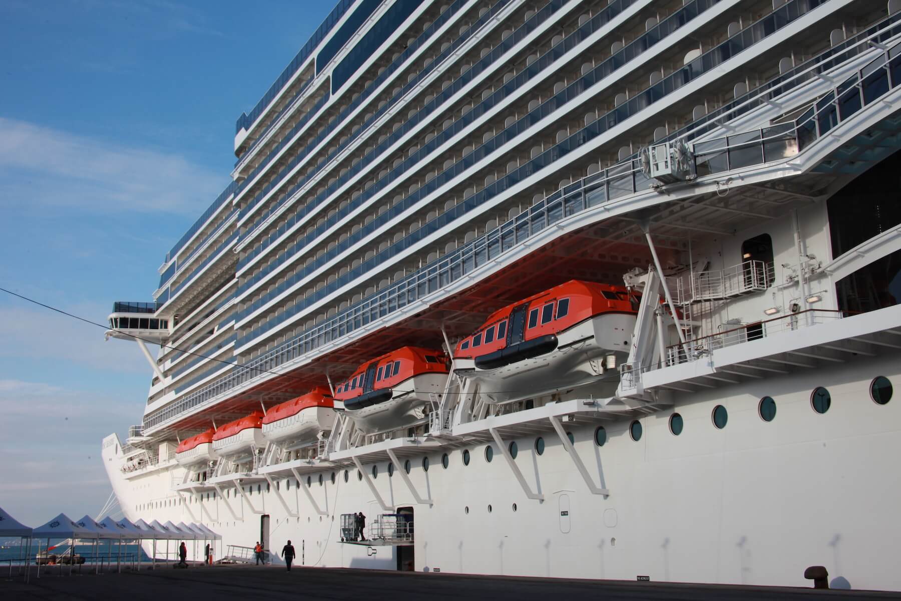 This is in fact a very notable feature of both Queen Victoria’s and Queen Elizabeth lifesaving systems, which primarily comprise 16 enclosed lifeboats and tenders, characterized by two types of davits. These two Queens are the only two ships where such a solution has been chosen, to offer them the best of both alternatives.